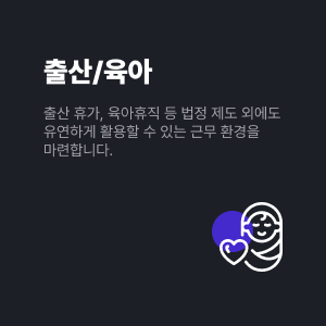 출산 휴가, 육아휴직 등 법정 제도 외에도 유연하게 활용할 수 있는 근무 환경을 마련합니다.